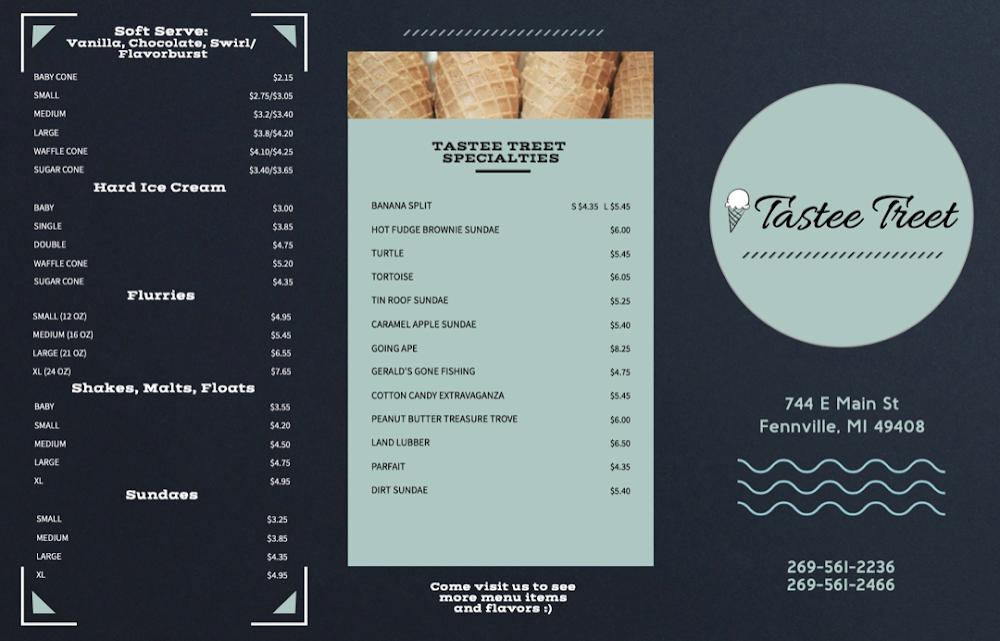 Welcome to Tastee Treet, your go-to destination for delicious ice cream and quick bites located at 744 E Main St, Fennville, MI. Our laid-back and inviting atmosphere makes it perfect for solo diners and families alike. Enjoy a variety of treats, from mouthwatering burgers and chili-dogs to our famous sundaes and creamy milkshakes. We offer convenient services such as drive-thru, takeout, and delivery. With accessible seating and parking, we ensure that everyone can join in the fun. Visit us today for a delightful culinary experience, and don’t forget to try our signature fudge!